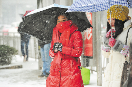 低温雨雪天气,市民外出要做好御寒准备,防止感冒等疾病。瞧,这两位美女在前几天的风雪中“全副武装”,把自己包裹得严严实实。 陈飞 摄