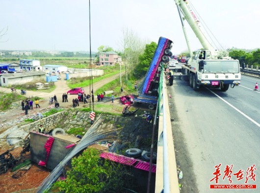 上午10点,记者在出事地点看到,两辆货车已经冲下十多米高的跨桥,其中一辆货车驾驶室已经与车身断开,飞到几米外的水渠旁,车头扭曲成一团。另一台装满钢筋的大货车悬空挂在桥边上,吊车正在对车上的钢材进行吊离。