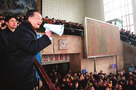2008年初,我国南方地区普遍遭受了历史上罕见的特大冰雪,交通堵塞。1月29日,温家宝赶到长沙火车站,看望慰问旅客。