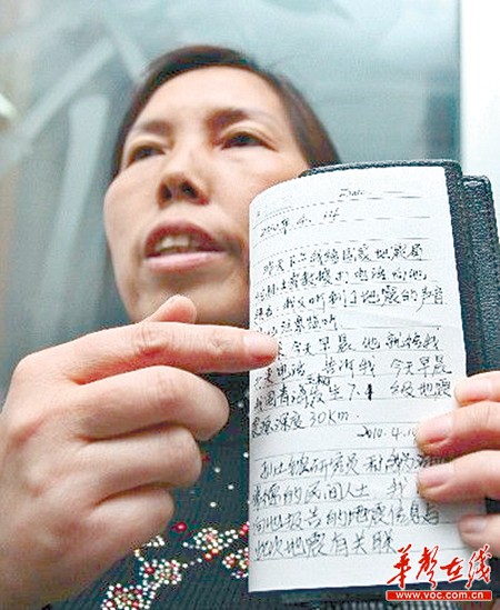 肖红云展示她的地震“预报”日记。 (资料图片)