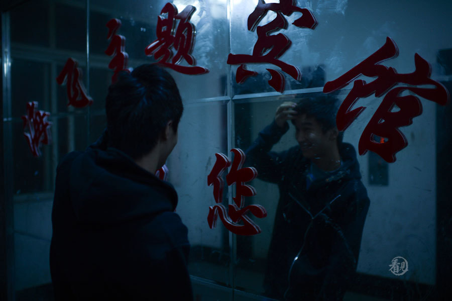 3月20日,晓亮在旅馆前的镜子面前臭美一番,每次出台前他都会照照镜子。摄影:杨抒怀