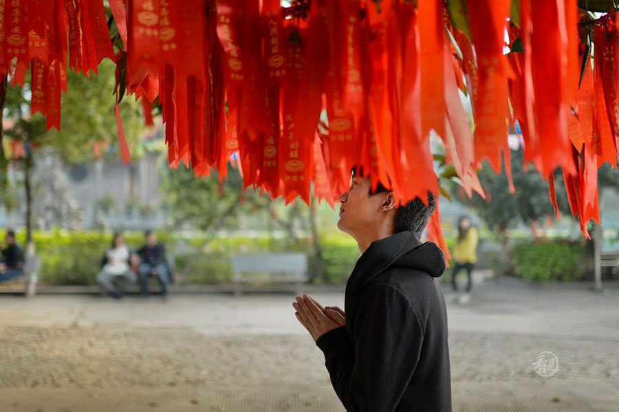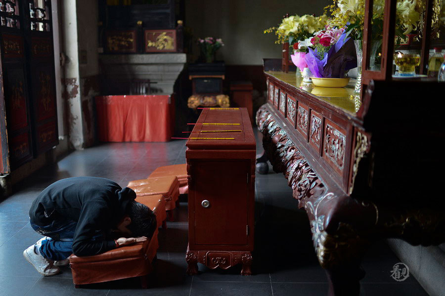 晓亮每次都会虔诚叩拜。他说,获得宽恕就会有新的开始。摄影:杨抒怀