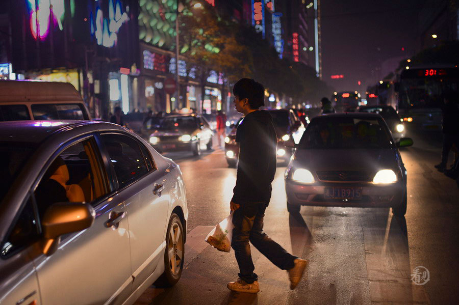 3月23日,在行人如织的步行街,晓亮和他的客人很快埋没在夜色中,酒吧街的夜是迷离、躁动、没有人注意到这对看似普通的少年。摄影:杨抒怀