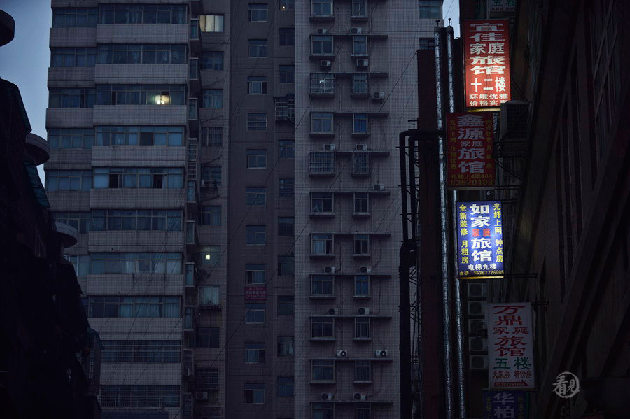 3月22日,夜幕下,小旅馆的招牌,都打开了,在长沙解放西路,附近的街道,有许多这种小旅馆,从有日租也有月租,几十块到上百元不等,许多喝醉酒的男女都在此开房,周末更是一房难求。摄影:杨抒怀