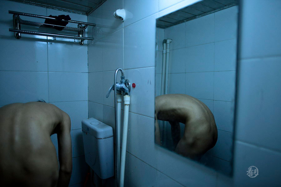 3月23日,晓亮在小旅馆洗澡,他很少洗澡,也很少换衣服,一套衣服穿了十来天。摄影:杨抒怀
