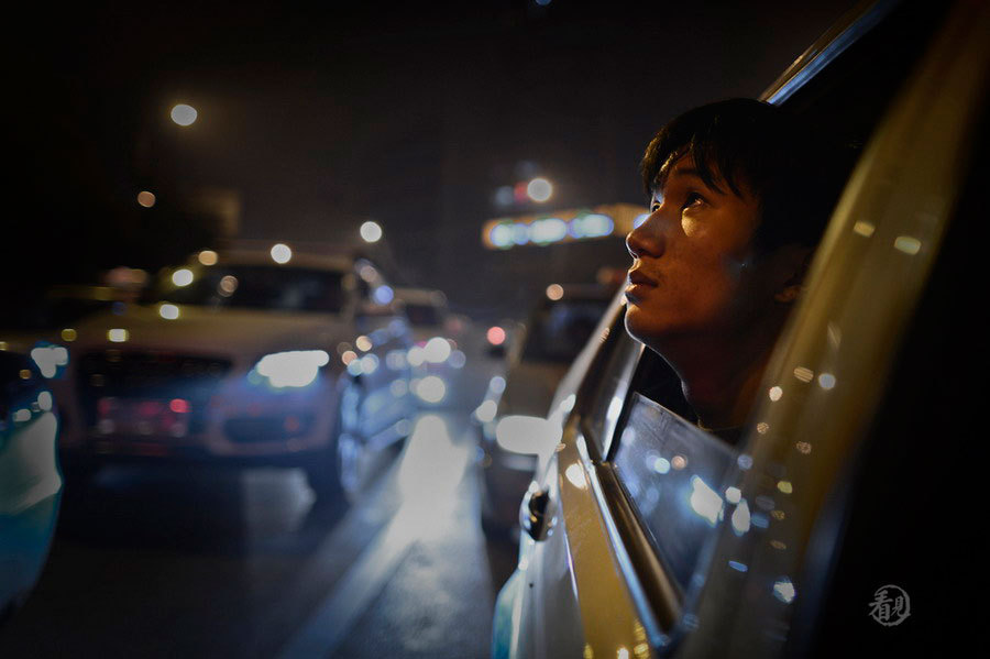 3月31日,在去出台的路上,晓亮将头伸出窗外,对于未来,晓亮说他想出家。摄影:杨抒怀