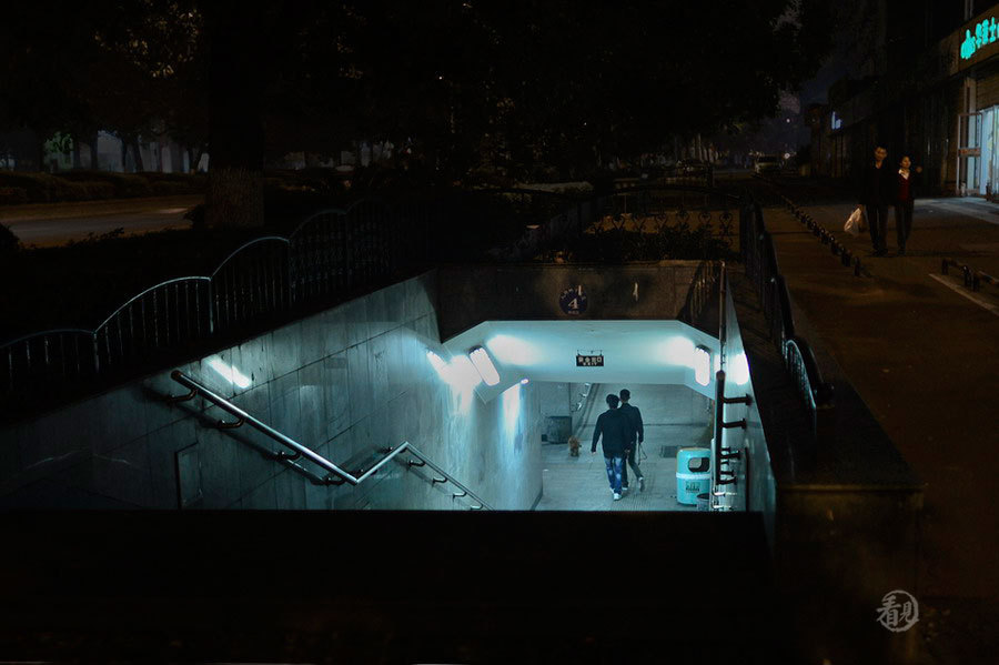 3月31日,与客人见面后,晓亮走在客人身后,跟客人一起回家。通道与地面如同两个世界,一对情侣光明正大的走在路上,走在地下通道的晓亮就如同他的职业一样,是另一个世界,要在地下进行。摄影:杨抒怀