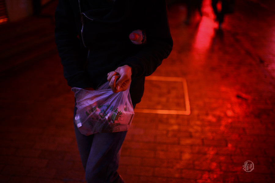 3月23日,晓亮带着客人去旅馆附近的性用品店买“安全套”。买完套,晓亮说自己很饿,让客人请自己吃点东西。晓亮说这个客人今年大学毕业,很帅,个子很高。摄影:杨抒怀