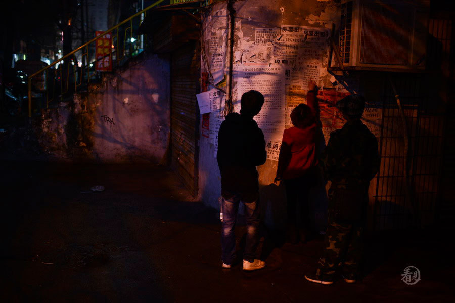 3月19日,晓亮在路边看租房信息,最近他没地方去,想找个地方暂住。摄影:杨抒怀