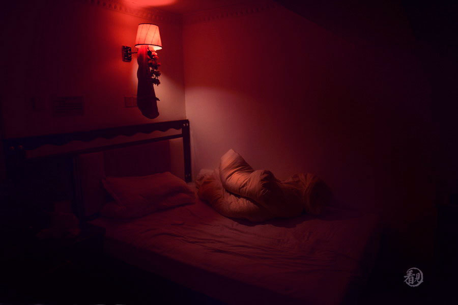 3月20日,解放西路附近某小旅馆,激情过凌乱的被子与床单,屋子里暧昧的灯光与欲望交织在一起。这是个高危边缘行业。据统计,艾滋病病毒感染者和病人中,同性性传播比例占绝大多数。摄影:杨抒怀