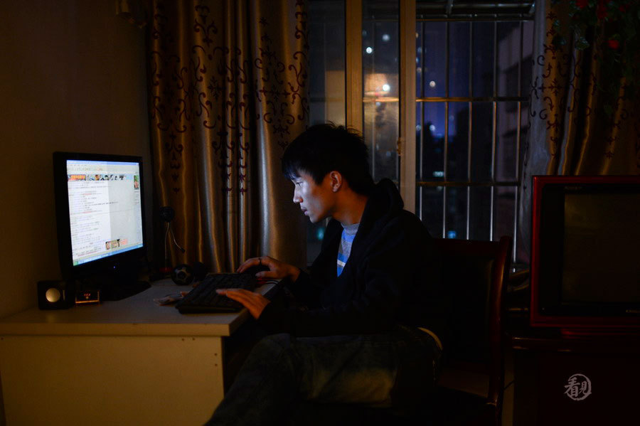 晓亮无聊地在床上休息。来长沙时间不长,朋友不多,多是在网上认识的圈里人。摄影:杨抒怀