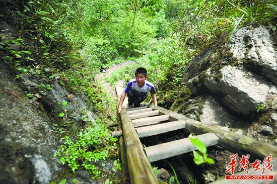 爬过悬崖峭壁上2架近乎垂直的天梯、走过崎岖山路、趟过溪流、穿过峡谷,这不是户外运动爱好者的冒险之旅,这是湖南桑植县苦竹坪乡张家湾村学生余启运的艰难求学路。