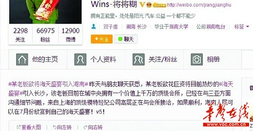 最近,三亚“海天盛筵”因涉嫌聚众淫乱被炒得沸沸扬扬,众多明星模特纷纷发微博澄清,想要“撇清”关系。而新浪微博认证的知名媒体人、策划人@Win-将将糊今天发布微博爆猛料:有老板欲将“海天盛筵”引入湖南,届时会有湖南味儿的海天盛筵供欣赏。