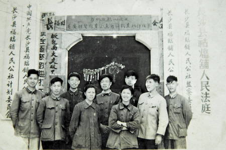 上世纪50年代,母亲随市委工作组在长沙县福临铺人民公社工作。母亲在前排左三。左四是同为市委工作组的女干部陆芳。其他多为公社干部。这是他们在当时福临铺人民公社大门前的合影。