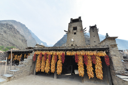 “神秘的东方古堡”四川理县桃坪羌寨一居民家挂满丰收的玉米。 特派记者李锋 摄