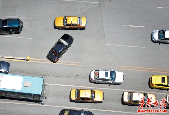 6月23日上午,长沙市车站中路八一路口,一辆黑色小车正往左越过一道白实线,最后它成功地越过3道白实线,开到左转车道左转。 记者 田超 摄