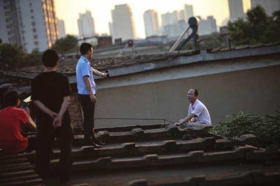 6月13日,长沙桐梓坡社区新12栋楼顶,警方在劝说欲跳楼的麻将馆老板。当天下午,因为10元钱,麻将馆老板“和平”捅死熟客“肖妹子”,持刀在楼顶与民警僵持两个多小时后,跳楼身亡。图/记者赵赫廷
