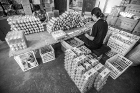 被挑选出的皮蛋,根据大小、体型来分级,送到包装车间进行包装。图/记者李坤