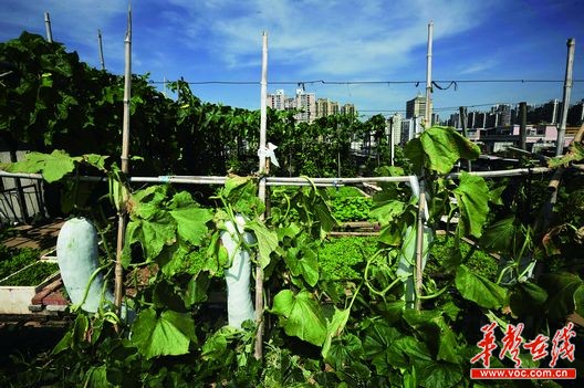 7月26日上午,长沙市开福区国庆新村的许金虎在自家楼顶种植了大片蔬菜瓜果。记者 童迪 摄