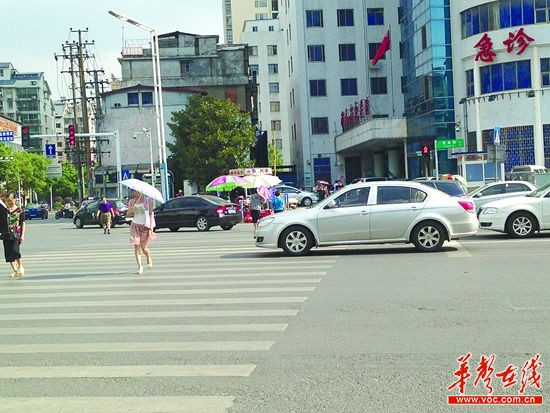 华声在线7月10日讯 42米长的人行斑马线,22秒人行绿灯时间。今日中午,长沙市营盘路蔡锷路口多名行人过街闯红灯被罚举交通警示牌1小时。人行绿灯中途“变脸”,让烈日下“罚站”的颜小姐很委屈。过往行人纷纷表示,行人过街时间太短,一路小跑仍面临进退两难的窘境。