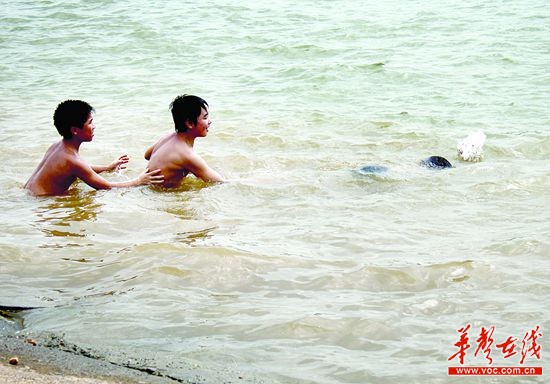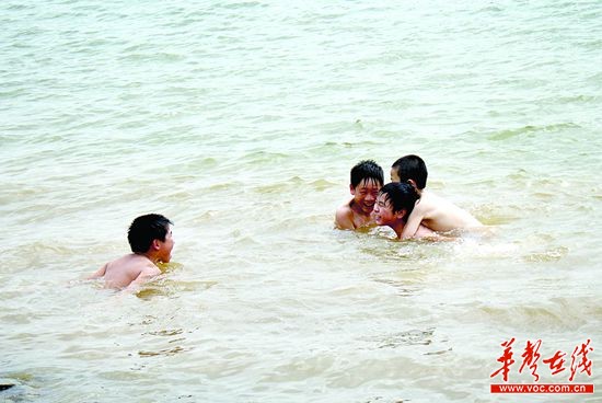 7月5日下午,长沙市风帆广场附近水域,四个小孩在水中嬉戏,其中一人突然溺水,另外的小孩赶紧去救,所幸有惊无险,小孩被救出水面。但这一险情并没让小孩警觉,几分钟后他们又扎入水中。而该地段正是长沙六大“新高危水域”之一。实习生 何佳乐 摄