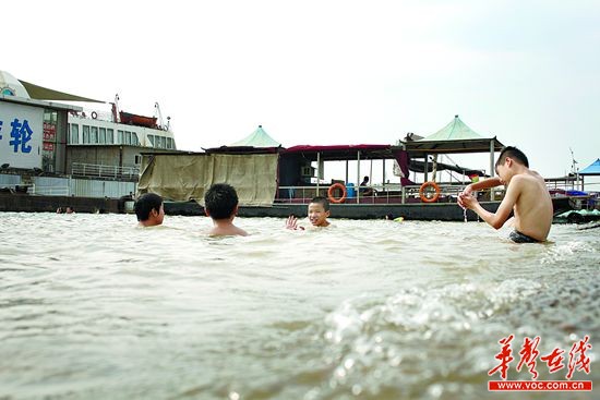 7月8日,长沙市湘江边上的风帆广场,不少市民在此游泳,有些是长期在此游泳的游泳爱好者,有的家长带着小孩过来一起游。从安徽来长沙务工的汪国发每天都要带着孩子来湘江边游泳一个小时。“孩子刚来长沙,没有学校的报告书,不能享受免费游泳,收费的话我又负担不起。”
