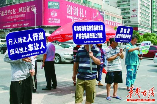 上午10点,芙蓉路松桂园路口,四五名市民手举蓝底白字的交通文明宣传牌,正在劝导交通。他们既是交通违法者,也是交通文明劝导者。