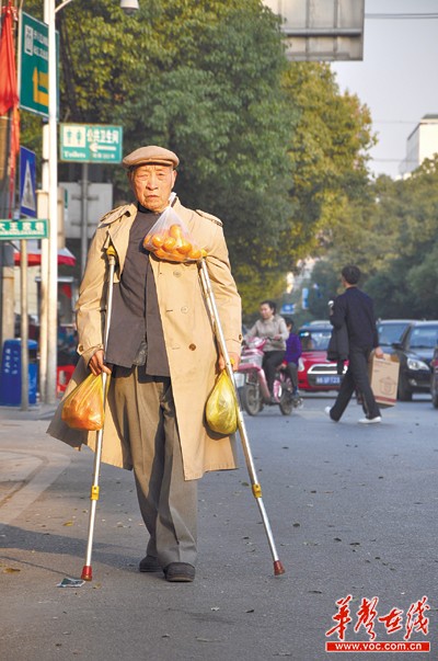 3月6日, 长沙市湘雅路一位老人杵着拐杖独行。 我省的老年人数量已过千万,而老人的精神赡养却常常易被人们忽视。实习记者 唐俊 摄