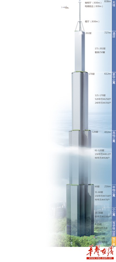 7月21日,媒体披露了这场开工典礼,依据示意图,一个令全世界炫目的项目亮相:天空城市高838米,比目前世界第一高楼迪拜塔还高10米,涵盖医院、学校、敬老院等,整栋大楼内“除了火葬场什么都有”。