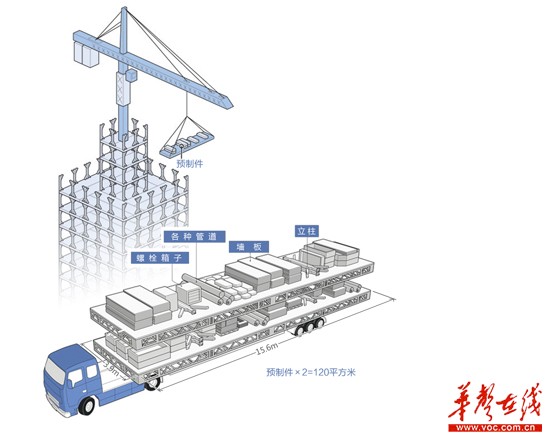 面对“7个月能建成世界第一高楼”的质疑,刘江山介绍,天空城市采用工厂化生产,用类似搭积木的方式建成。工人先打好地基,再用从卢森堡进口的H型钢材搭好主体框架,然后装载主板和内外墙。在开工之前,建筑所需的主板和墙板已在工厂生产完毕,运到工地后一次性吊到安装部位,工人只需要拧螺丝,刷漆。每辆大卡车可以运输120平方米的可建空间,主板上摆放了本房间安装所需的立柱、斜撑、门窗、墙体,甚至洁具和餐具。