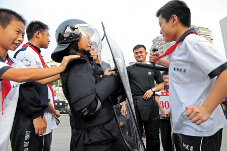 “这是88式狙击步枪、95式突击步枪,这是防暴枪。”讲解员逐个介绍,学生们小心翼翼拿起枪支研究,提出各种稀奇的问题。第一特警大队几名全副武装的战士被学生们围起来,像参观稀有动物:“特警哥哥你可以笑一下吗?”