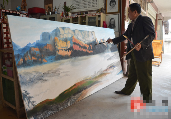 记者采访时,他正在习作一幅宽3.2米、高1.5米的油画作品,看见他认真画画的那股劲儿,都不忍打扰他。在休息时,他告诉记者,这幅画还未命名,计划在年底前完成。入画的是在大坪镇看见的天门山,有蓝天白云作伴、高山显得灵气逼人,山下则是一片美丽的田园风光,反映的就是最真实的农村生活。