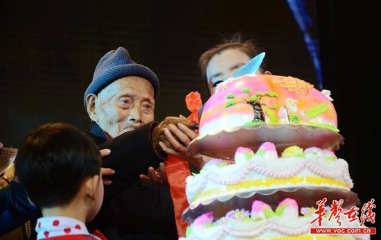 102岁的董国民老人亲手切开了主办方准备的巨型“微孝蛋糕”,老人眼里泛起泪花。 记者 李毅 摄