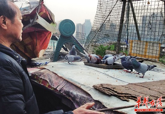 12月10日,长沙市开福区滨江美寓,覃爹心疼地看着自己喂养的信鸽,10天内,鸽子少了3只。记者 童迪 摄