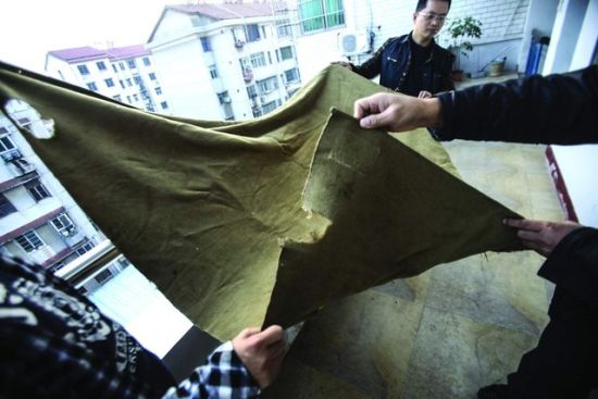 12月3日,岳阳县,有关人员展示当时日军使用的军毯。