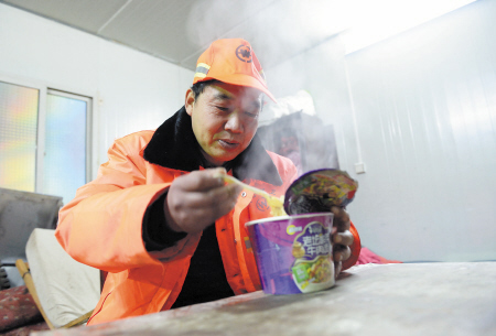 昨日1时30分,利用短暂的休息时间,龚冬平吃了碗方便面补充体力。