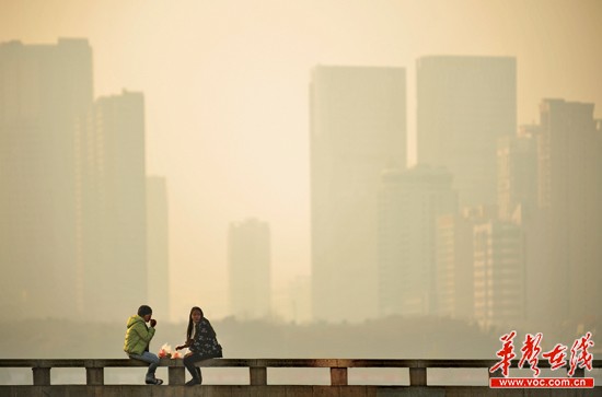 ▲1月14日下午5时,长沙市湘江北路,两名女孩在江边聊天。当日,长沙城区遭遇雾天,直至日落能见度仍然不高。记者 童迪 摄