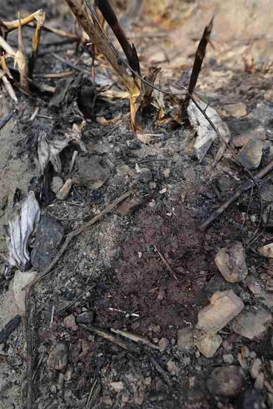 2月1日,湖南省涟源市七星街镇田湖村村干部肖兆生勇扑山火不幸牺牲村的遇难现场留下一滩血和被烧后的衣服。特约摄影郭国权