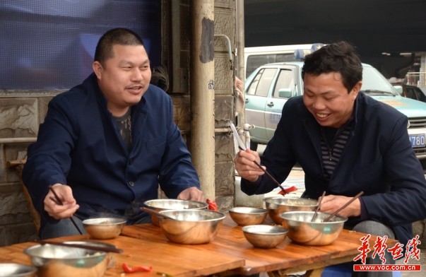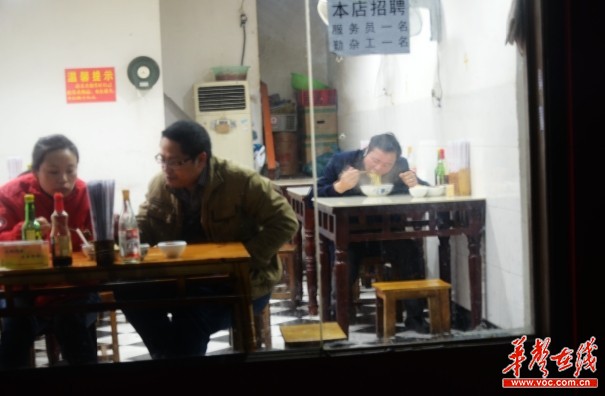 6点10分,詹永利(右一)狼吞虎咽地吃着一碗面条,热腾腾的蒸汽笼罩了他。