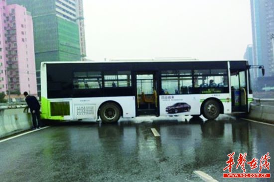 华声在线3月23日讯 “我转弯时看见前方地面上有很多油污,赶紧踩刹车,但已经来不及了,车子打滑,失控横着漂了出去。”今天10时多,长沙市开福区波隆立交桥东往北的匝道上,一辆公交车失控发生“漂移”,横着身子严严实实地卡在了桥上护栏间。过往的市民忍不住惊呼:卡成这样,考验技术。