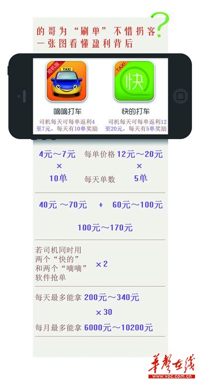 快的、嘀嘀两大打车软件价格战继续打响,这就意味着想拿到更多的奖励,的士司机必须让更多的乘客用支付宝和打的软件“刷单”。不少的哥为了“抢单”而专挑“手机客”,甚至想出拒载、甩客、长途拆单等“奇招”。