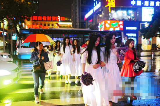 4月21日,在最喧嚣最灯红酒绿的解放西路,古色古香的太平街,烟雨蒙蒙的岳麓山,突然出现了十个身着白色连衣裙脚穿白色老回力鞋的女孩子。她们头上带着薰衣草花环,手上拿着薰衣草干花,三三两两走在街头,白色的裙摆飞扬,每当有路人靠近,白衣女神们就会递上一张有淡淡香味的情书。