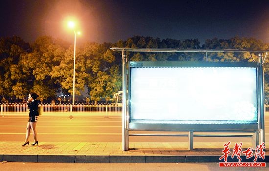 4月22日晚,长沙市湘江中路竹山园公交站,夜已深,一位市民还在站台上等车。记者 李健 摄