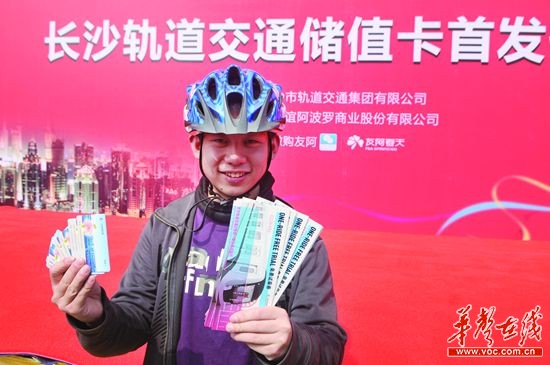 “您购买了9张卡,这是赠送的18张试乘券,请您收好。”9日上午10点,在收到900元办卡现金后,长沙轨道集团工作人员将卡和试乘券交到28岁小伙吴昊泽手中,吴昊泽成为抢到首批长沙地铁储值卡的第一人。