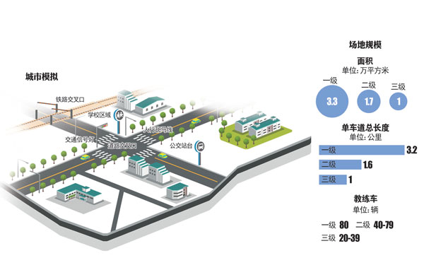 对于驾培教练场,要求最小训练规模应达到教练车总数不少于100辆,建有能够满足全部训练车同时停放的停车场,并设置与其他区域之间的隔离设施。各训练项目连接处应设置缓冲路段,一般应大于1.5倍训练车长。单车道训练道路行车道宽度不小于3.5米,双车道不小于6.5米。训练道路要设置十字形、T字形、环形及模拟道路与铁路交叉口等道路交叉口至少各1个,训练场内交通信号灯不少于2套。