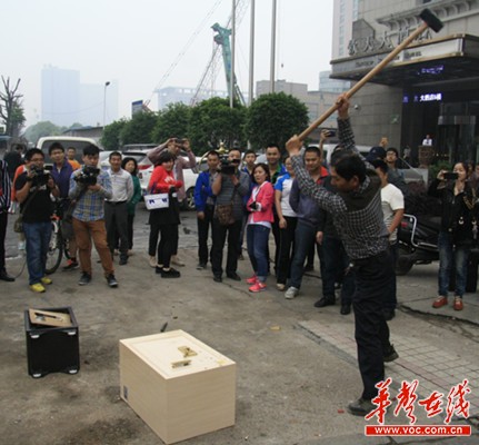 5月19日,在长沙举办的“百万求盗走”新闻发布现场几乎成为媒体的聚焦场。在长枪短炮和各式摄像机的关注下,100万巨款被放进半米高的王力保险柜内,随后在5个人的努力下,保险柜被搬运到人来人往的大街上。