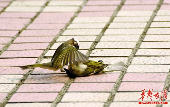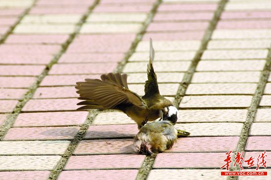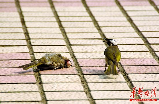 记者请湖南省环保联合会理事长何建军辨认,这两只鸟学名白头鹎,俗称白头翁,一种吃害虫的益鸟。“这分别是雌雄两只白头翁,死去的是雌鸟。”