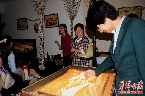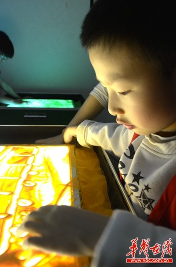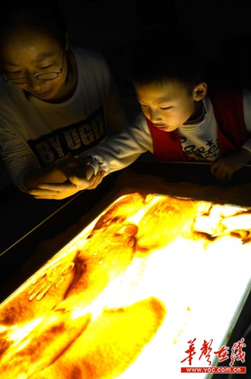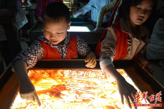 华声在线5月11日讯(记者 李毅 王卉珍)“这是我们画的双层大蛋糕,祝妈妈节日快乐!”沙画台后面,8岁的陈翊明、刘书瑞挥着沾满彩沙的小手介绍着自己的作品,“节日蛋糕”的旁边还有几个歪斜的大字——“妈妈我爱你”。