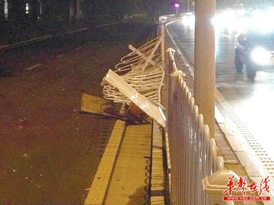 6月25日晚9点多,石马铺公交站附近,“的哥”拖行电动车车主400多米后撞破护栏翻车。(网友供图)