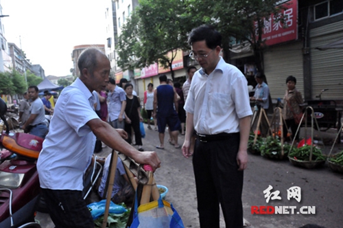 麻阳县委书记胡佳武(右)与城北市场附近的贩菜老人交谈。